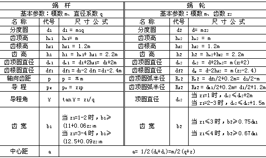 蝸桿蝸輪的主要參數(shù)有:模數(shù)m、蝸桿分度圓直徑d、導(dǎo)程角γ、、中心距a、蝸桿頭數(shù)z1、蝸輪齒數(shù)z2等,根據(jù)上述參數(shù)可決定蝸桿與蝸輪的基本尺寸,其