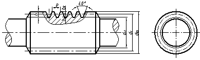 蝸桿一般選用一個(gè)視圖,其齒頂線、齒根線和分度線的畫(huà)法與圓柱齒輪相同,如下圖所示。圖中以細(xì)實(shí)線表示的齒根線也可省略。齒形可用局部剖視或局部放大圖表示。